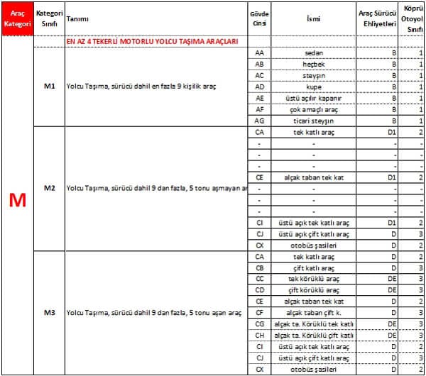 Aşağıda bu yönetmelik kapsamındaki araç kategorilerini ayrıca giriş paragrafında belirttiğimiz araçların köprü ve otoyol kullanımlarındaki sınıflandırmalarını ve bu araçları hangi sınıf ehliyete sahip sürücülerin kullanmaları gerektiğiyle alakalı tabloları görebilirsiniz.